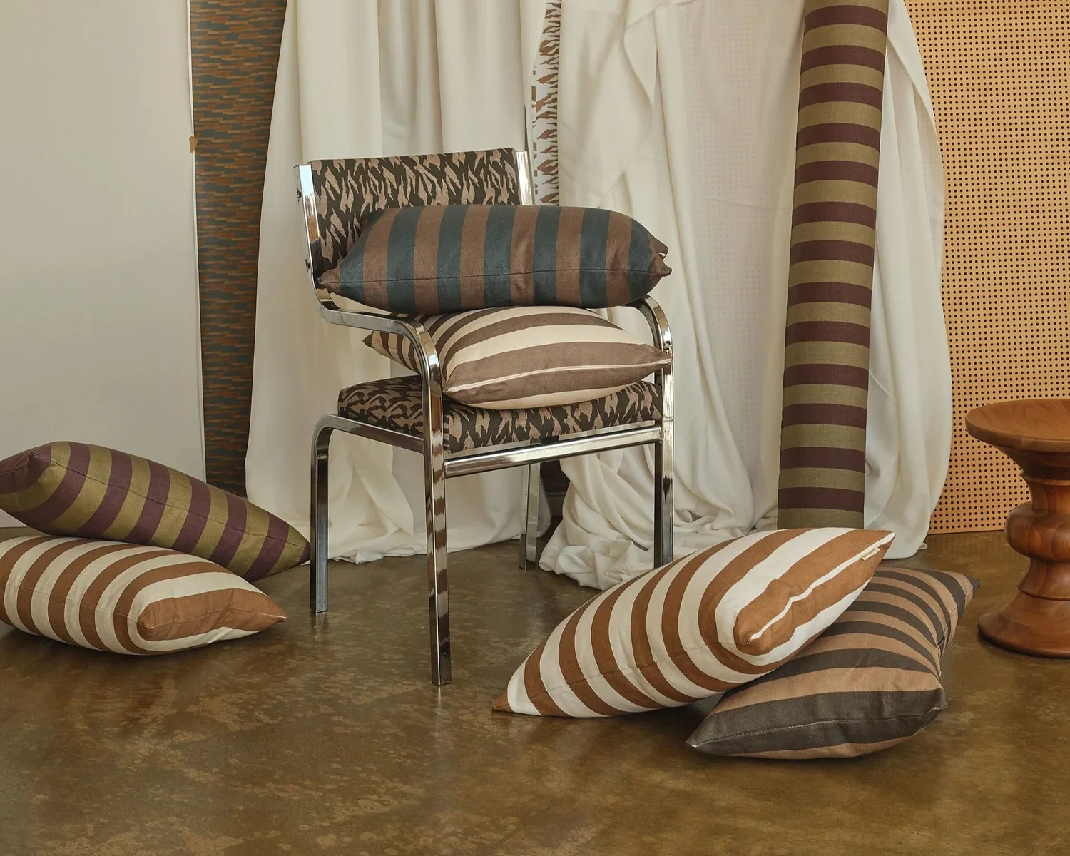 “While the technical side of my design process is self-taught, my path has been shaped by colleagues and other makers who’ve shared and guided me. It takes a village, and with every collection I continue to learn"” she says. “I painted with acrylics or watered-down acrylics, then put those artworks into a digital format and played with repeats. The stripes aren’t perfect and that’s what gives them character.” Her process celebrates small imperfections, giving each pattern a sense of warmth and movement.